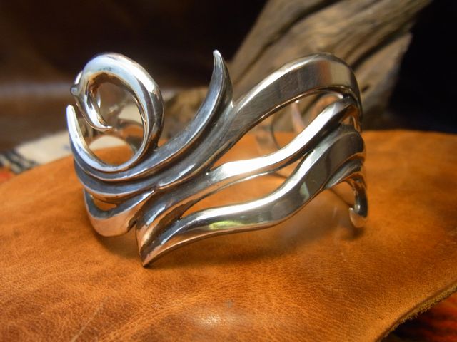 シルバー925の幅40?の銀板から切り出し、削り、躍動感がうねるアラベスクを更に削りだした、確固たる一点モノ!!